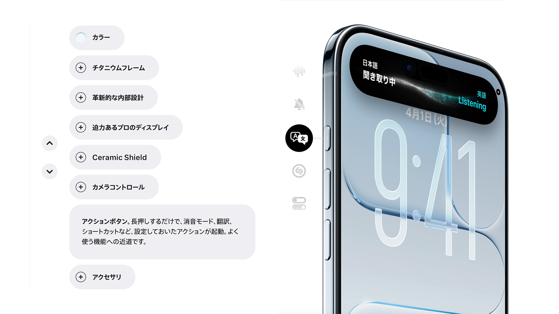 Appleのグローバルなデザイン言語を基盤に、日本市場における文化的文脈を踏まえつつ、精度・明瞭性を損なうことなく最適化を実施。各部門と密に連携し、キービジュアルや画面UIを細部まで精査。